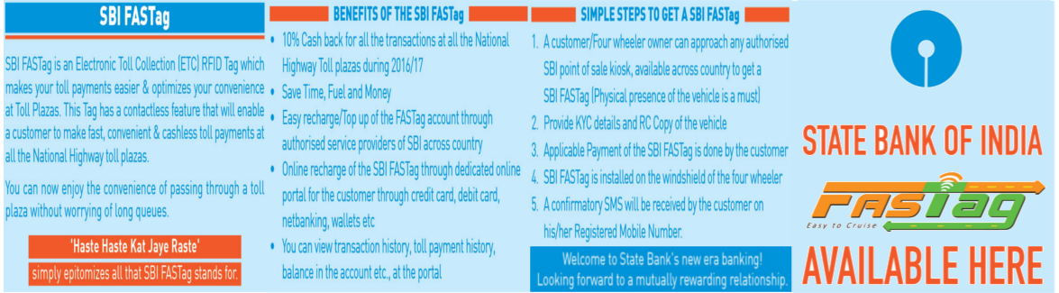 Govt of India is planning to make FASTag mandatory at all the NH toll plazas w.e.f. 1st Dec 2019. As per NPCI data, the penetration of FASTag is only 30% currently. This will create opportunity to tap new market. We need participation of maximun agents for marketing of SBI FASTag.